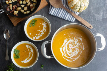 A delicate and flavourful soup, brought to the next level by adding a savoury and sweet topping of Pink Lady apple and streaky bacon.